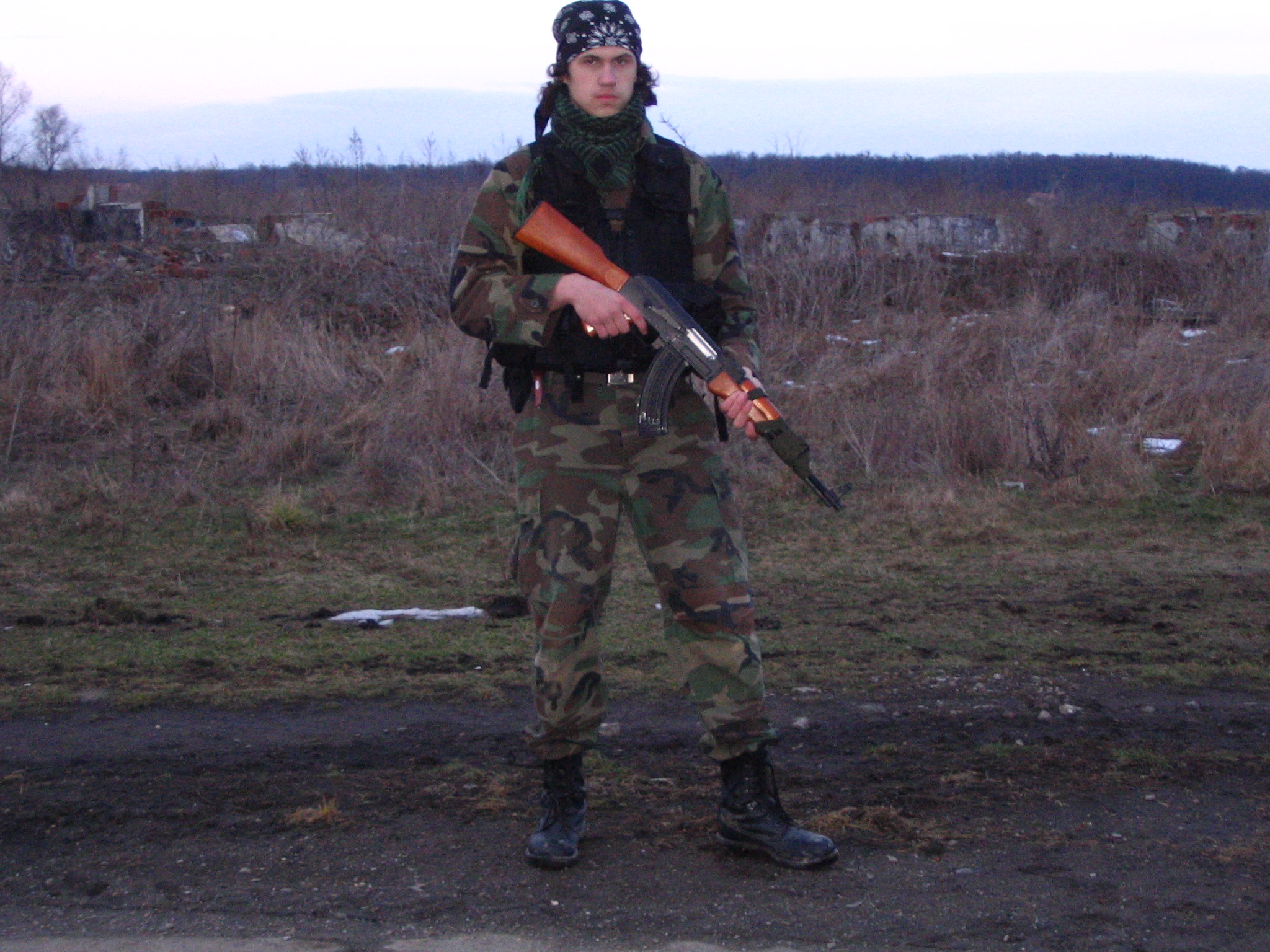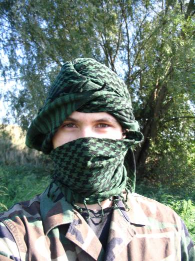 Výstroj: BDU woodland, MOLLE vesta, shemag, kukla, kanady, hejkal-made in home, klobouk woodland